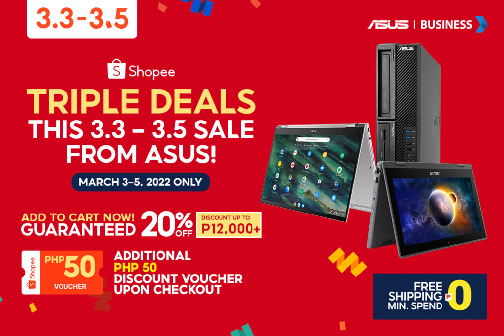 Take advantage of these exclusive offers from March 3 – 5, 2022 and visit ASUS Shopee, ROG Shopee and Expert Series Shopee on these links – https://ph.asus.click/shopee, https://ph.rog.gg/shopee, and https://ph.asus.click/expertseriesshopee to get your hands on participating ASUS Vivobook, Zenbook, Expertbook, ROG Laptops, TUF Gaming Laptops, ASUS Desktops, ROG Phone and more.