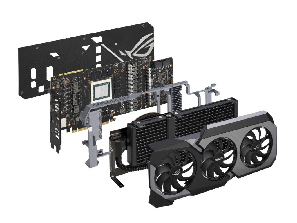 The ROG Matrix integrates a pump and radiator under the shroud, enabling closed-loop cooling without requiring more space than an air-cooled card