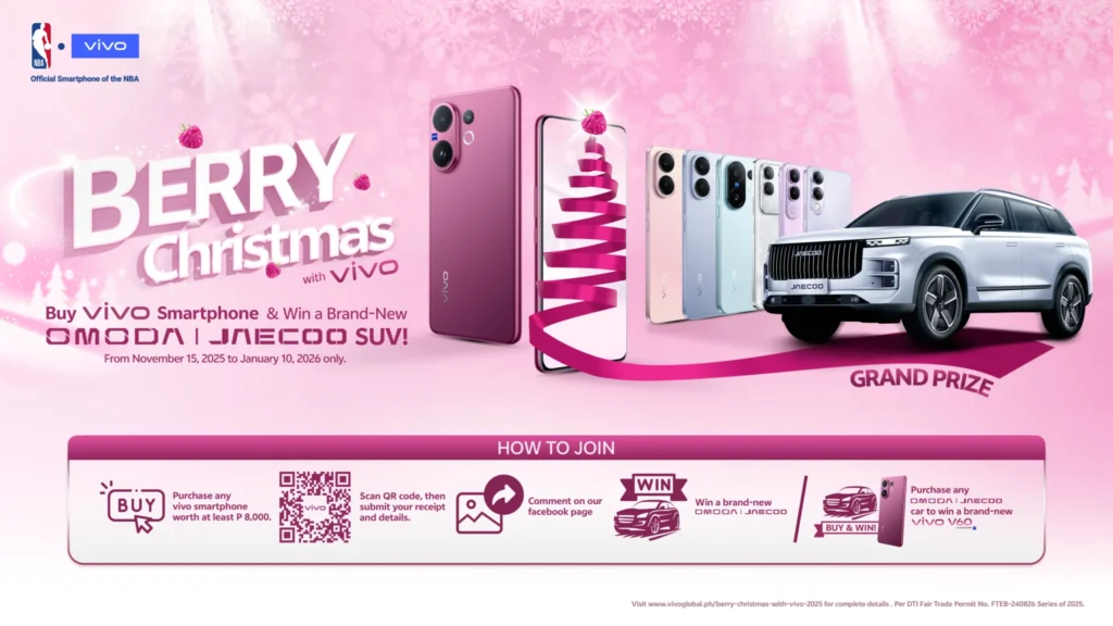 They may also follow vivo on Facebook, Instagram, TikTok, and X for promo updates, announcements, and winner posts. See full mechanics here: www.vivoglobal.ph/berry-christmas-with-vivo-2025/.