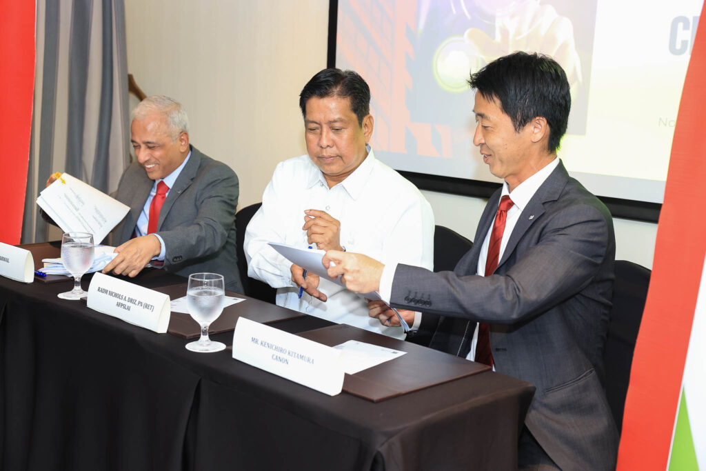 L-R) Anuj Aggarwal (President and CEO, Canon Marketing Philippines), RADM Nichols A. Driz, PN (Ret) (President and CEO, AFPSLAI), Kenichiro Kitamura (BIS Director, Canon Marketing Philippines)