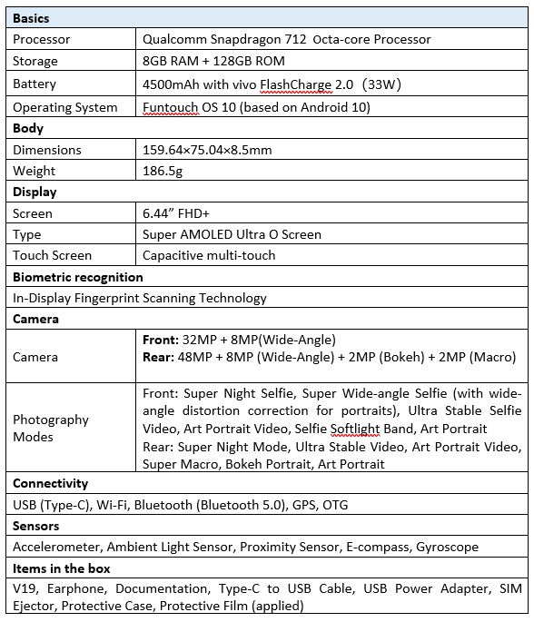 In addition to industry-leading selfie capabilities and sleek design, V19 has elite performance and high battery efficiency. A super capacity 4500mAh battery provides long-lasting durability, while 33W vivo FlashCharge 2.0 technology enables a 0 to 54 percent charge in just 30 minutes, offering convenience for fast-moving consumers.