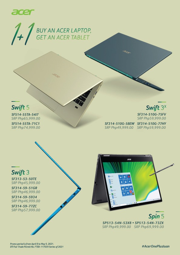 Manila, Philippines—Hit two birds with one stone with #AcerOnePlusJuan promo. You surely wouldn’t want to miss the chance to get a free Acer One 8 T2 tablet when you buy an Acer Swift of Spin laptop from April 8 to May 9, 2021.