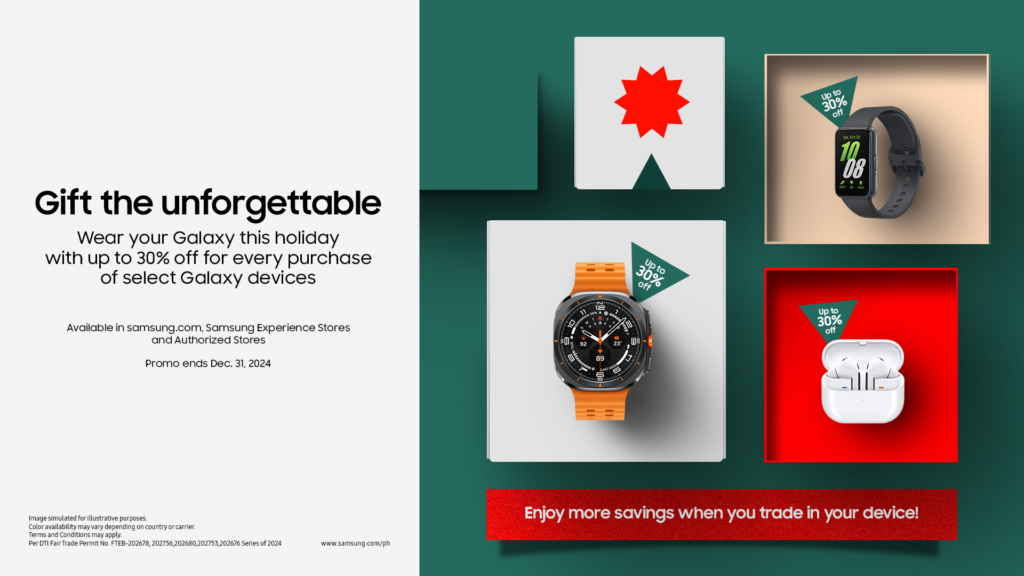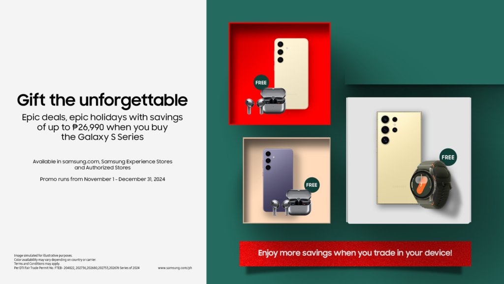 During the holiday sale, enjoy a FREE Galaxy Watch7 worth Php 16,990 when you purchase the Galaxy S24 Ultra or the Galaxy Z Fold6. Alternatively, take home a FREE Galaxy Buds3 worth Php 8,990 with every purchase of the Galaxy S24+, Galaxy S24, or Z Flip6. Plus, you can save up to Php 10,000 with Trade-in, unlocking total savings of up to Php 26,990!