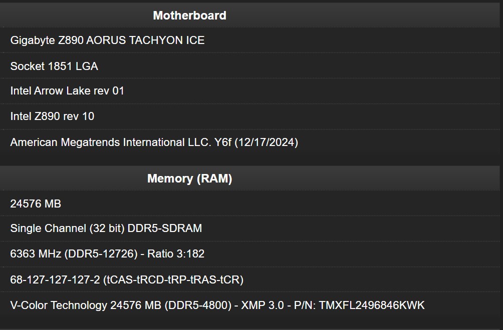 GIGABYTE TECHNOLOGY Co. Ltd, a household name in motherboards, graphics cards, and hardware solutions, is once again making waves. The company has achieved an overclocking feat that’s turning heads: the Z890 AORUS TACHYON ICE motherboard paired with the latest Intel® Core Ultraâ„¢ (Series 2) processor has reached an eye-popping DDR5-12726. This was made possible thanks to their exclusive LN2 SWITCH function and the V-COLOR Manta Xfinity RGB. Legendary overclocker HiCookie led the charge, setting this new record and reinforcing GIGABYTE’s position as a front-runner in cutting-edge technology for overclocking enthusiasts.