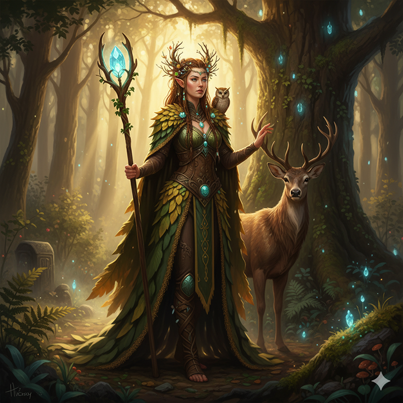 “A female elven druid with a braided hairstyle and a cloak made of leaves, realistic, cinematic lighting, fantasy art.”