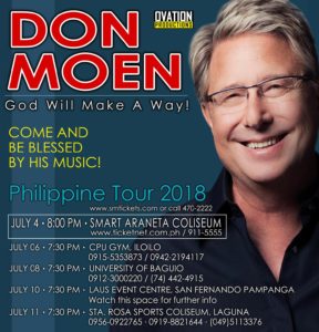 (The Don Moen 2018 Philippine Tour is presented by Ovation Productions. For ticket prices and other inquiries, contact the following: Ticketnet 911-5555 for Manila concert; and SM Tickets 470-2222 for provincial concerts.)