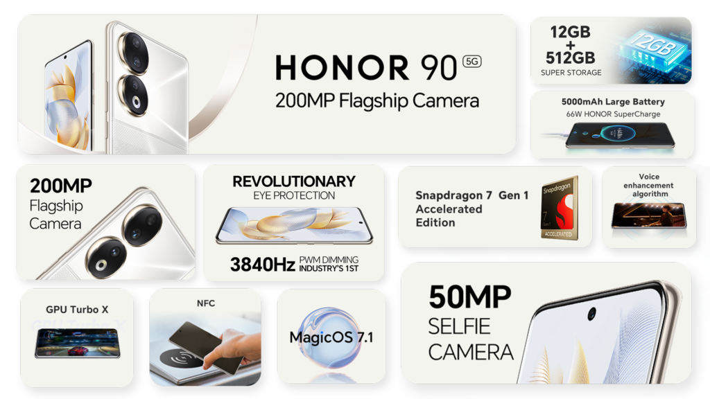 The HONOR 90 5G is powered by the Qualcomm Snapdragon 7 Gen 1 Accelerated Edition processor, which provides fast and smooth performance. The smartphone also runs on the latest Android 13-based HONOR MagicOS 7.1, which offers a number of new features and improvements.