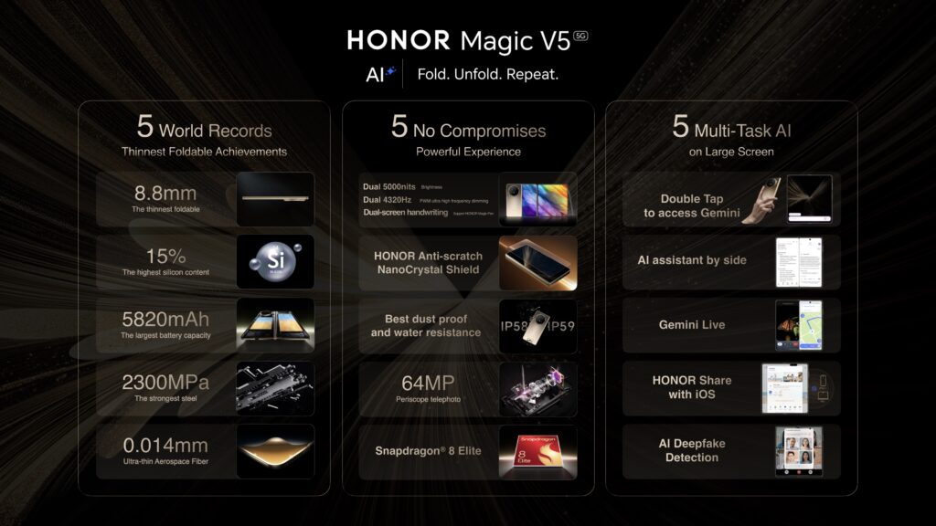 Both displays support stylus input and boast 120Hz refresh rates with peak brightness up to 5000 nits. Whether you’re indoors, outdoors, or somewhere in between, the Magic V5 shines—literally.