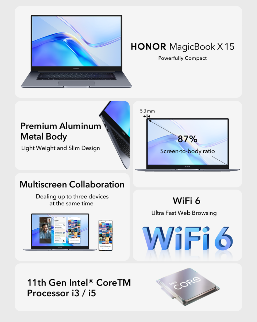 Powered by a 11th Gen Intel® CoreTM processor, the HONOR MagicBook X 14 and HONOR MagicBook X 15 deliver an upgraded performance, enabling users to run multiple tasks at the same time at incredible speeds, offering greater productivity.