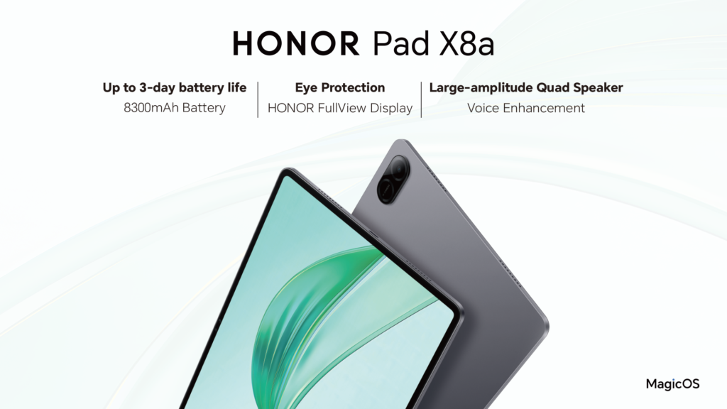 The HONOR Pad X8a A Powerhouse Tablet with amazing battery life boasts a premium design with a sleek metal body and a comfortable grip. Its 11-inch HONOR Eye Protection Display offers a wide-angle viewing experience with vibrant colors and a high refresh rate for smooth visuals.