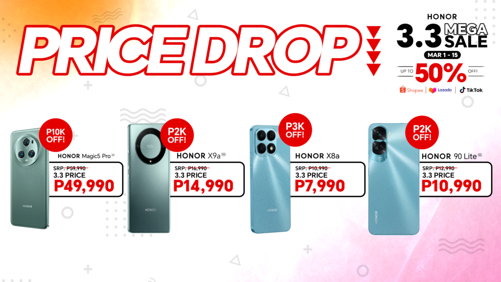 - Shopee:Â Check out Shopee’s 3.3 Mega Shopping Sale for amazing offers on the HONOR X9a 5G (Php 2,000 off) and the HONOR X8a (Php 3,000 off).