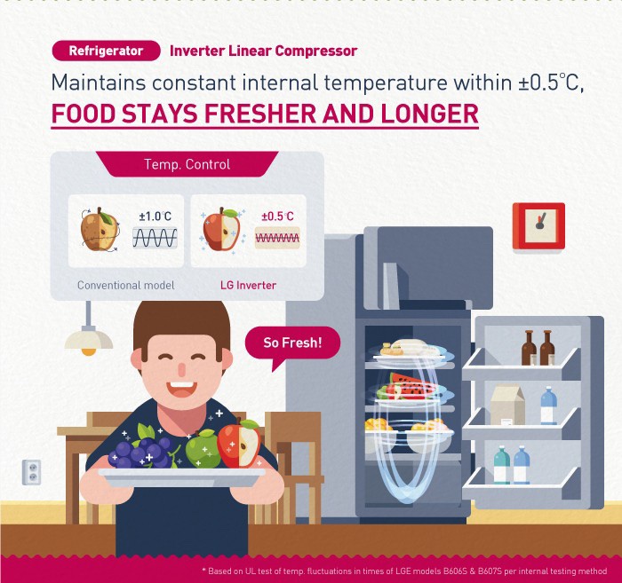 For LG Refrigerators, the technology helps you keep food fresh longer. Inverter technology does a better job by maintaining temperature fluctuation within ±0.5℃. This allows you to cook with fresh ingredients every day for your family.