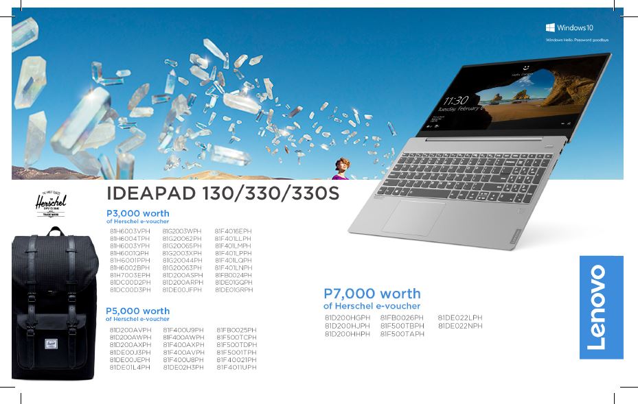 Free Php3,000 worth of Herschel e-voucher will be given to buyers of select IdeaPad 130/330 powered by an Intel Core i3 or AMD Ryzen 3 processors and buyers of the S300 Series powered by the Intel Core i5/i7 or AMD Ryzen 5/7 processors.