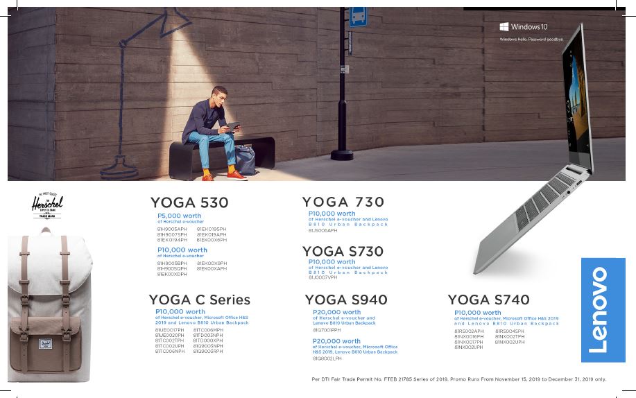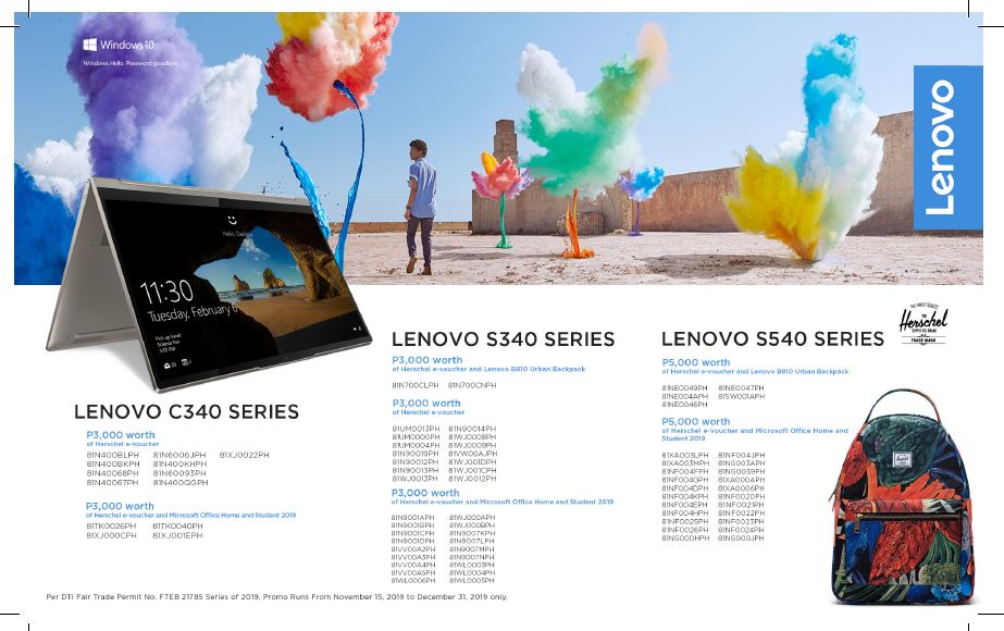 Depending on the model, buyers of select Lenovo IdeaPad, YOGA, and Legion devices from November 15 until December 31, 2019 are qualified for a chance to win up to PHP 30,000 worth of Herschel e-vouchers, Planet Sports gift cheques, and Lenovo accessories.