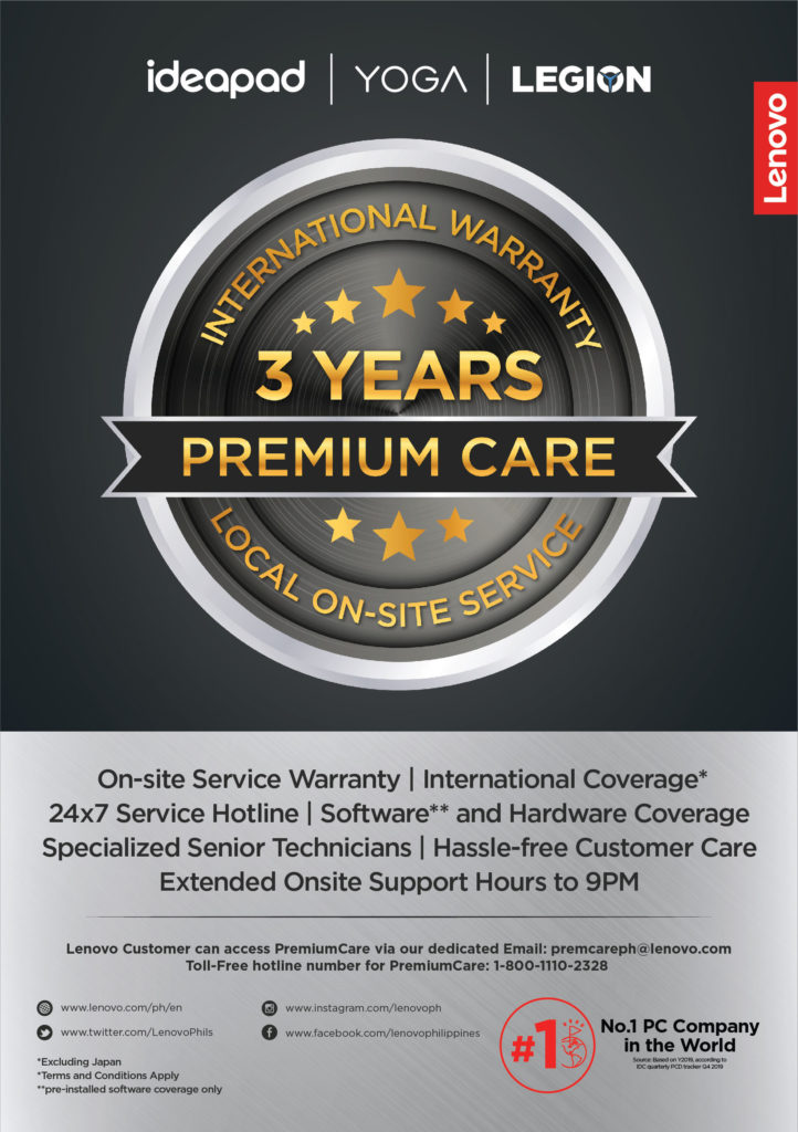 “At Lenovo, we are committed to putting our customers first, and this entails not only providing game-changing products but also extending them flexible and affordable technical support and solutions. The pandemic has disrupted day-to-day operations and pushed everyone to set up mobile working arrangements which leads to additional wear and tear to devices. Hopefully, with the added year of maintenance in our Premium Care service, our customers can spend their money on more essential goods in these trying times,” said Lenovo Philippines President and General Manager Michael Ngan.