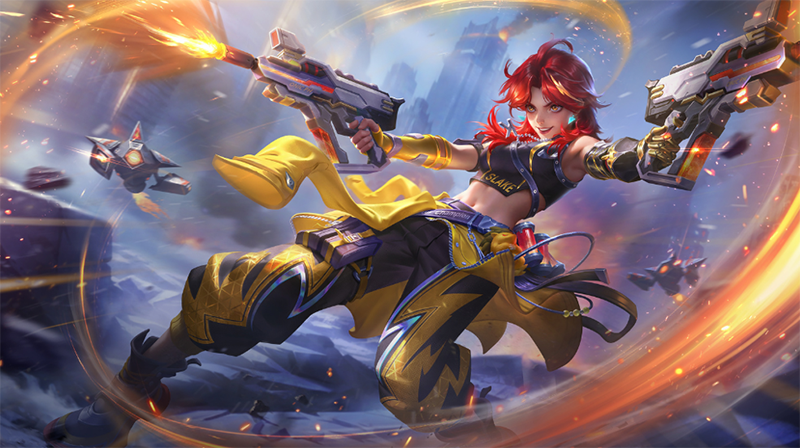 The yellow-and-black uniform channels ONIC’s team colors, while the tech-inspired firearms reflect Kelra’s sharp gameplay. But it’s the details that make this skin unforgettable: a hedgehog charm at her waist and the name “Slake”—Kelra’s child—emblazoned on the outfit.