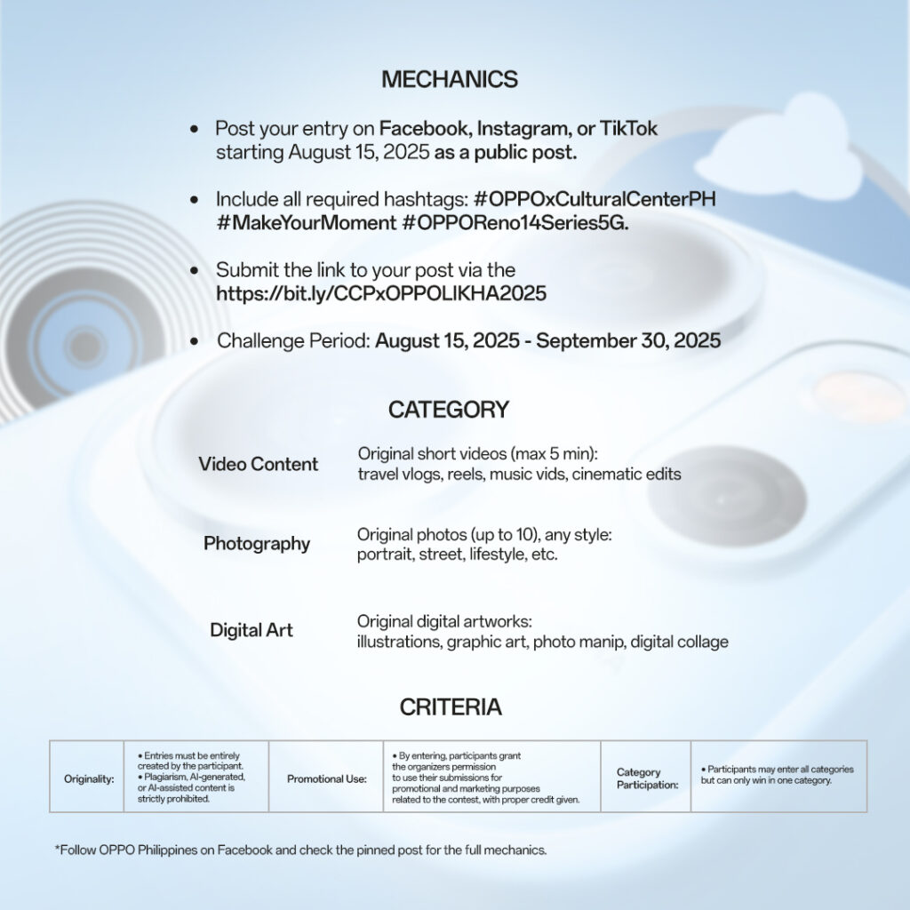 Winning entries may also be featured in an exhibit at Tanghalang Ignacio Gimenez, partner galleries, or select OPPO Concept Stores nationwide.