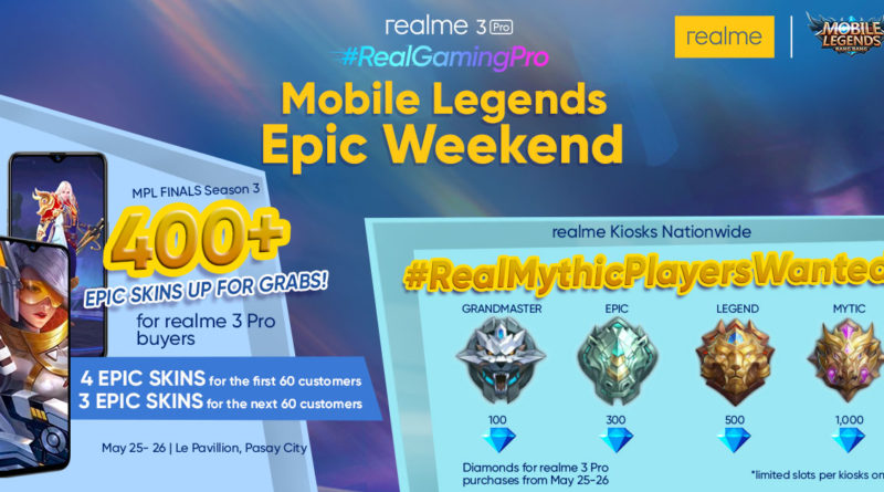 To further celebrate this milestone, realme Philippines launches the Mobile Legends Epic Weekend Promotion for consumers who will purchase the Realme 3 Pro on May 25 and 26. This includes two promotions: the #RealMythicPlayersWanted nationwide promo and Epic Skin Giveaway at the Mobile Legends Professional League Season 3 Finals.