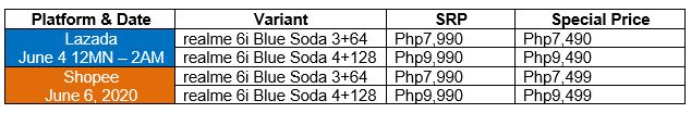 As initial offering for realme 6i Blue Soda variant, customers may avail special sale promos during the highly anticipated 6.6 e-commerce sale events of Lazada and Shopee.