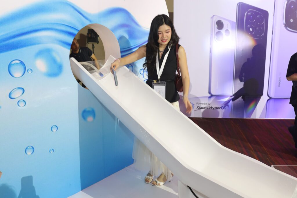 Attendees eagerly tested the Redmi Note 14 Pro and Pro+’s All-Star Durability and IP68-certified water resistance. The water slide quickly dropped a test model into the water, showcasing its ability to withstand submersion. The excitement in the air was palpable as guests marveled at the phone’s toughness.