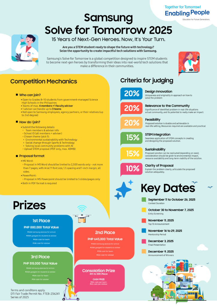Samsung’s Solve for Tomorrow is back—and it’s not just another science fair. It’s a global movement, now celebrating 15 years of empowering young minds through STEM. In the Philippines, 2025 marks its third run, and this year’s edition is bigger, bolder, and more tech-driven than ever. Solve for Tomorrow: Tech, Talent, Prizes, Real Impact