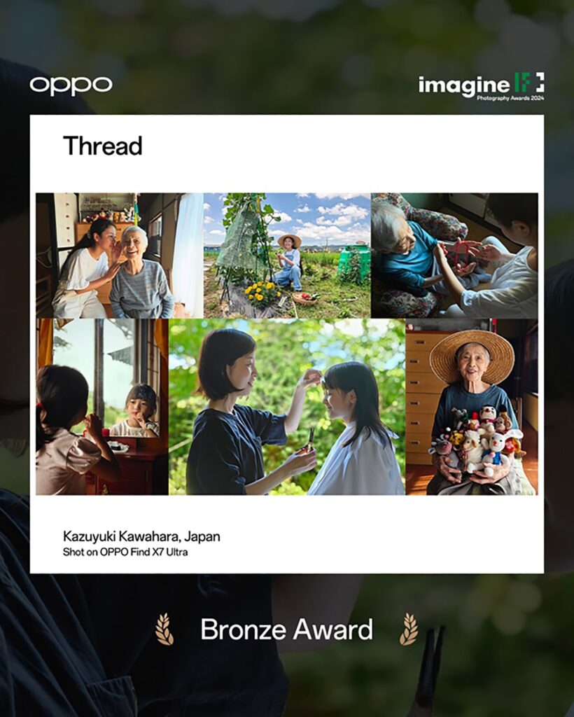 In the Japanese countryside, photographer Kazuyuki Kawahara used the OPPO Find X7 Ultra to document an intimate family scene featuring his daughters and their grandmother, who is living with Alzheimer’s disease. The series, titled “Thread,” won a Bronze Award and portrays three generations bonding and revisiting the grandmother’s fading memories.