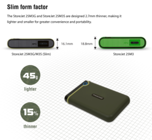 It also comes in a thinner and lighter package, weighing 45g lighter and 2.7mm thinner than the StoreJet 25M3, while retaining the iconic shock protection design. This allows greater convenience and portability, which makes the StoreJet 25M3G and 25M3S the perfect companion for those who are always on the go.
