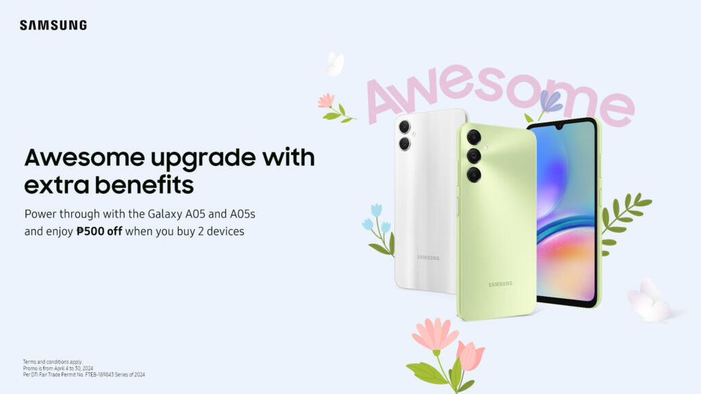 - Bundle Offer: Buy two Galaxy A05 or A05s and get P500 off + Free Travel Adapter