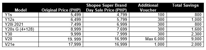 On the Super Brand Day, more products will be sold at a discounted price and shoppers can receive exclusive vouchers of PHP 1,000. There will also be a special and limited number of P6,000 off vouchers for the V20.The discounts at the vivo x Shopee Super Brand Day are as follows: