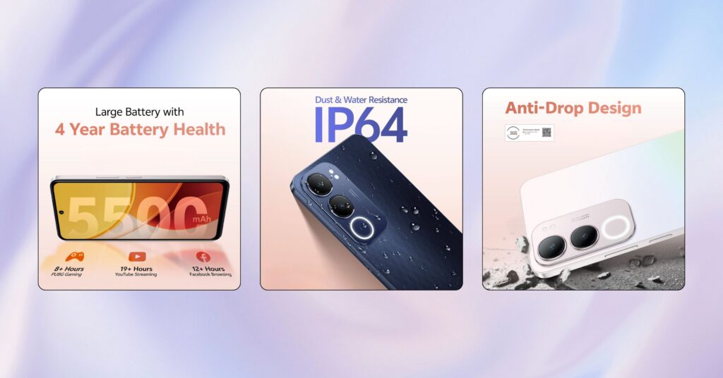 The vivo Y19s isn’t just about good looks—it’s engineered for quality and endurance. The smartphone is powered by a robust 5500mAh battery, designed to maintain optimal performance for up to four years. It also boasts IP64 dust and water resistance, making it ready for any adventure you embark on. The SGS 5-star drop-resistant body adds another layer of durability, ensuring the Y19s can withstand the rigors of daily use.