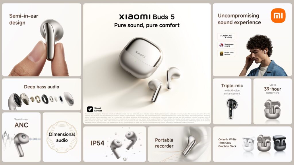 - Xiaomi Buds 5: Spatial audio, active noise cancellation, long battery life, comfortable fit
