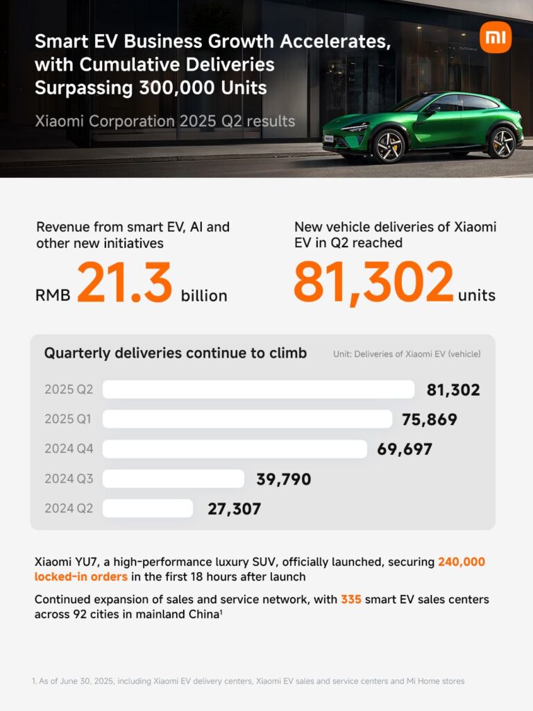 Deliveries? A record-breaking 81,302 units in Q2 alone. That brings cumulative EV deliveries to over 300,000 since launch. And this is before the Xiaomi YU7 SUV even hits the streets. With 240,000 locked-in orders in just 18 hours, the YU7 is shaping up to be the Beyoncé of SUVs—everyone wants one, and it’s always sold out.