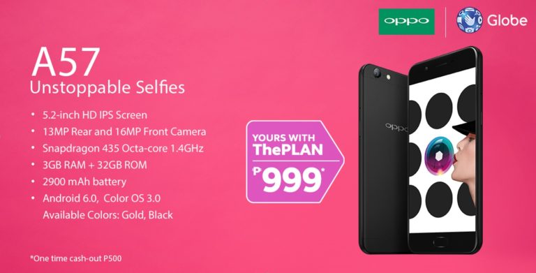 TechbeatCast Do Unstoppable Selfies with the OPPO A57 on Globe Postpaid ThePlan 999 Marco MaximoSeptember 25, 20172 mins OPPO Philippines and Globe Telecom now offers the OPPO A57 selfie-centric smartphone at Plan 999 with one-time cash-out of Php500….
