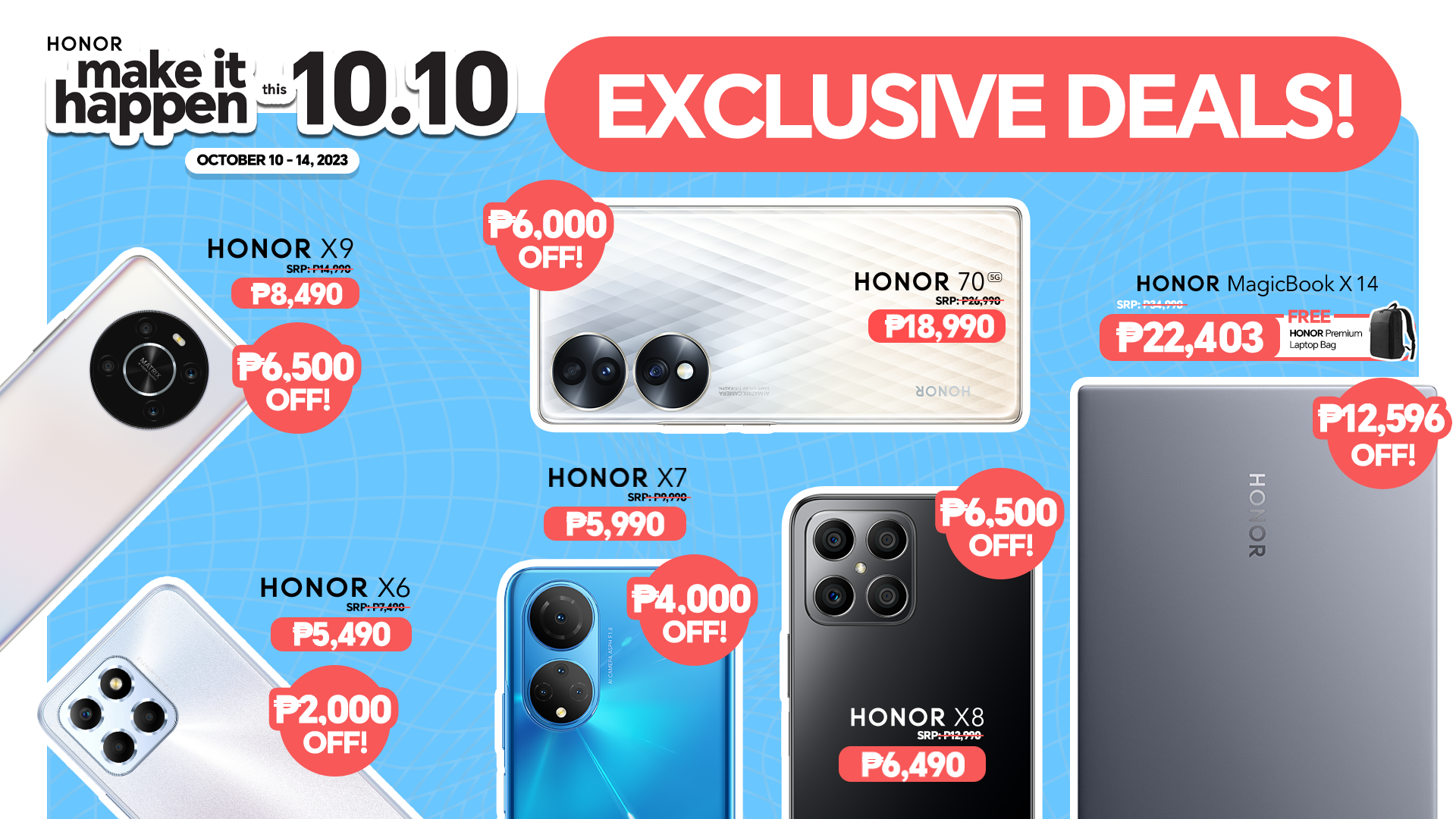 Manila, Philippines, October 6, 2023 – If you’ve been itching to upgrade your devices, now is the time. Get over Php 10K discount on HONOR products this 10.10 Sale, just head on to Shopee (bit.ly/HONORxShopeeMakeItHappenThis1010), Lazada (bit.ly/HONORxLazadaMakeItHappenThis1010), and TikTok Shop (bit.ly/HONORxTiktokMakeItHappenThis1010) from October 10 to 14, 2023!