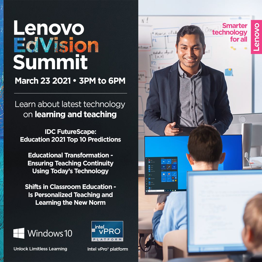 Themed “Bridging the Gap in Learning and Technology Under the Not so New Normal,” the summit will feature esteemed experts from Lenovo and collaborators Microsoft, Intel, and IDC. Speakers and panelists will discuss the transformation of education and implementation of new models of teaching, learning, and collaboration.