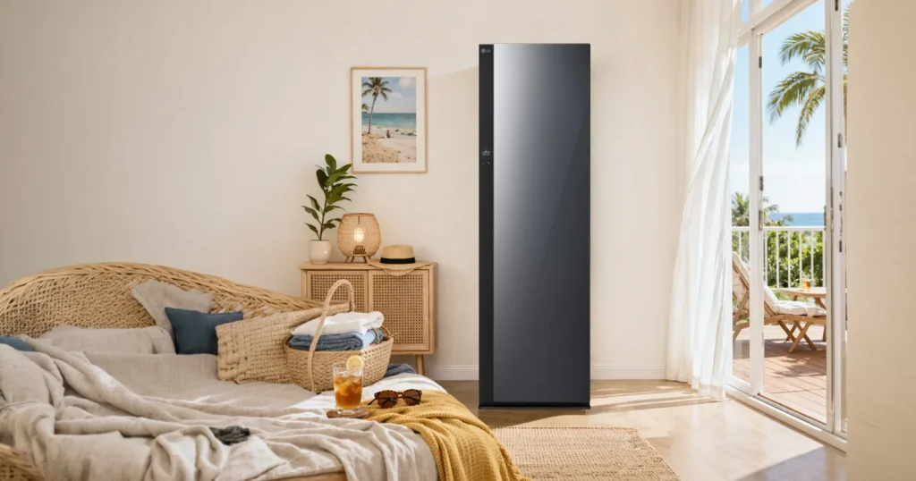 At the core of the LG Styler RX5 is Dual TrueSteam, which targets wrinkles and odors in lightly worn garments. Instead of traditional washing, the system uses steam to refresh clothes, making it suitable for daily wear items that don’t require a full wash.