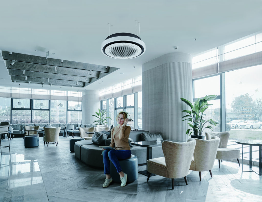 Now, if you’re running a boutique, café, or wellness space, the Round Cassette is your go-to. It’s sleek, circular, and finished in elegant white. With a slim 330mm body and 360° airflow, it cools evenly and quietly. The six-step Crystal Vane control lets you fine-tune the vibe—whether you want chill café cool or spa-like serenity.