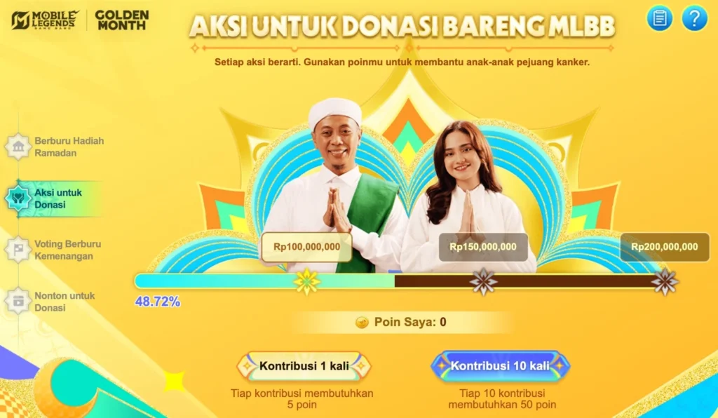 On February 21, MLBB introduced “BUKBAR Berbagi Kebaikan,” an in-game feature that transforms player participation into donation contributions. Through the “Berburu Kemenangan Bareng” event, players earn points by playing matches, watching videos, and completing in-game tasks. These accumulated points are then converted by MLBB into donation funds.