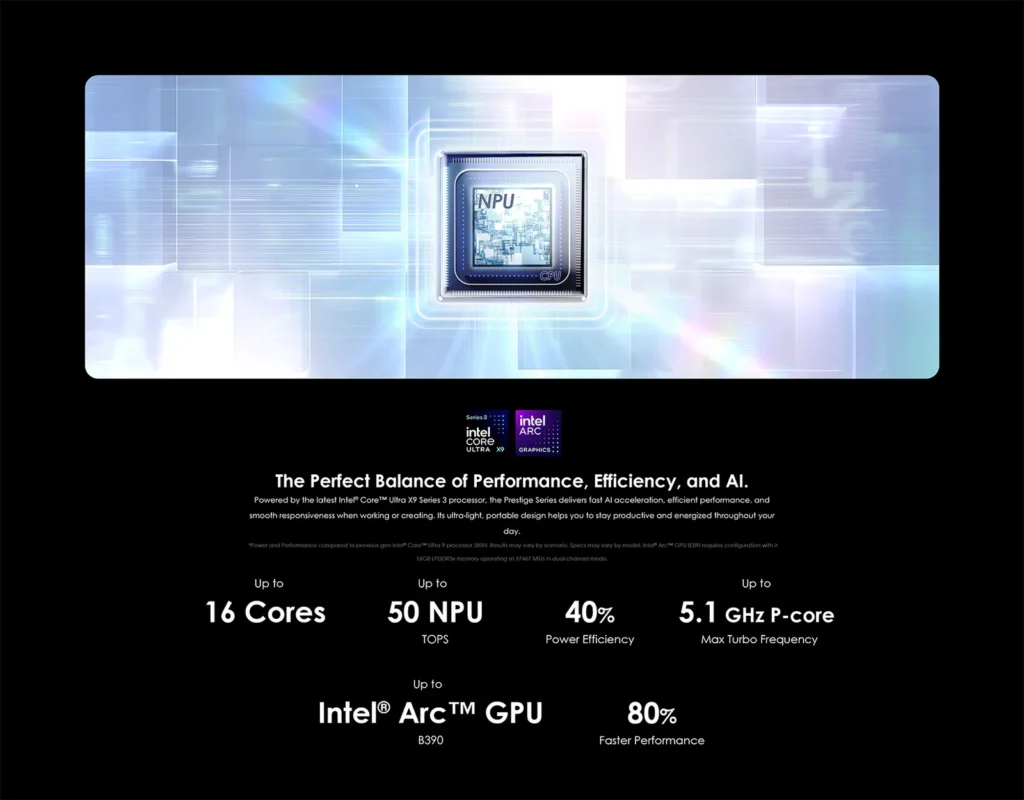 Select configurations of the Prestige Series are powered by the Intel Core Ultra 9 386H processor, part of Intel’s latest generation of chips designed for AI-enhanced computing.