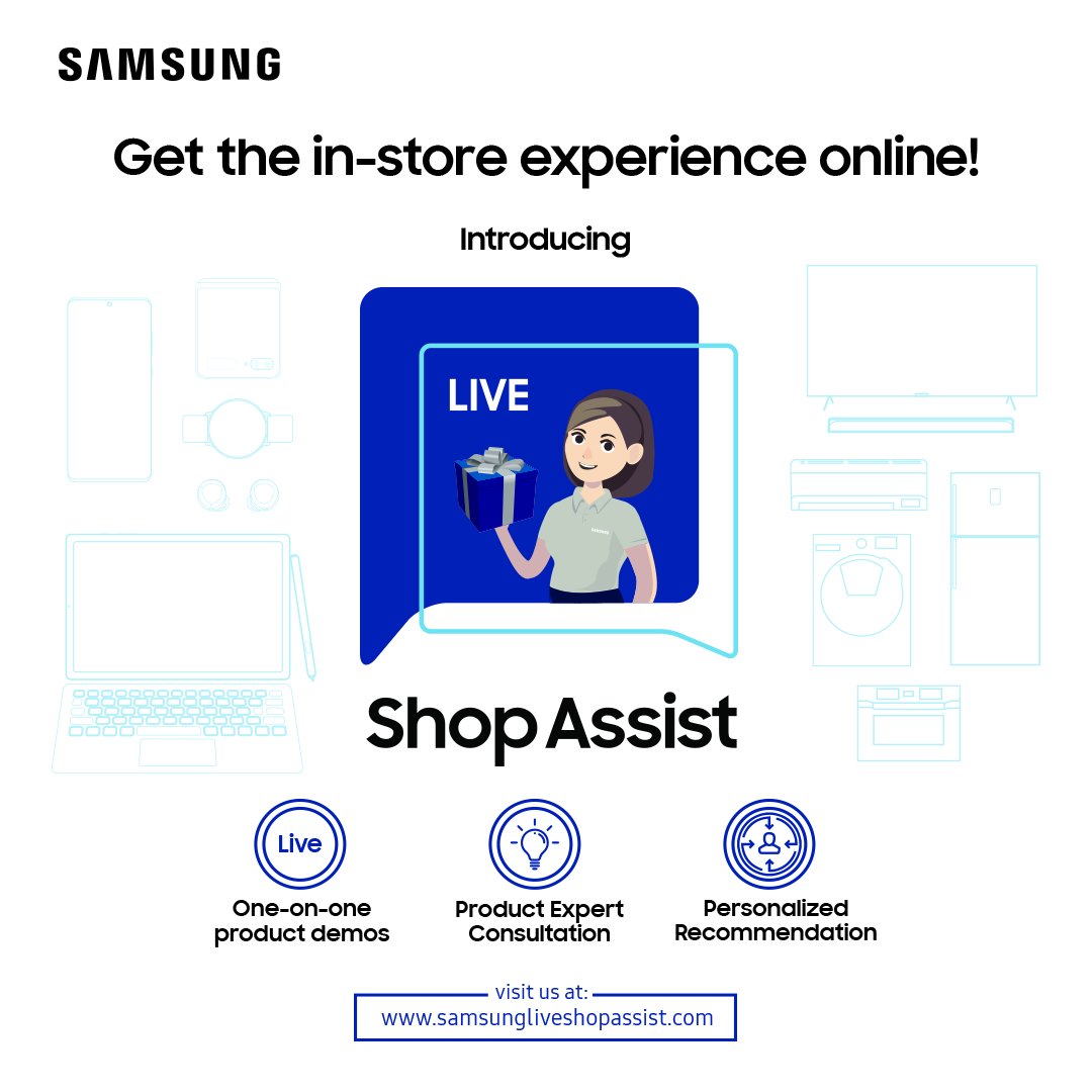 The Live Shop Assist service lets consumers opt to get assistance through www.samsungliveshopassist.com wherein consumers can choose a product group (mobiles, TVs, digital appliances, etc), start their consultation via livestream video call, chat, or voice call. The Live Shop Assist gives consumers the assurance of personalized and complete in-store shopping experience right in the comfort of their homes.gives online shopping a few unique twists to offer a pseudo “in-store” shopping experience at home.