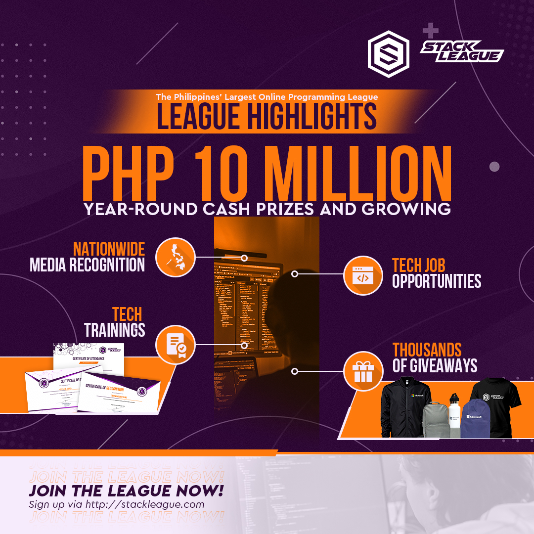 With over 10,000 contestants, a Php 10 million cash prize pool, free training, and opportunities to network with the country’s greatest developers, StackLeague is the Philippines’ largest year-round online programming league.