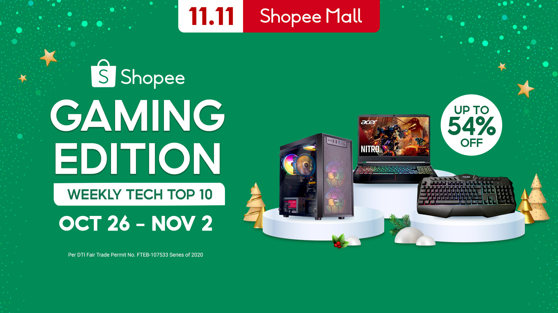 MANILA, OCTOBER 26, 2020 – Ready to make your streaming debut? Shopee is having an awesome sale that pros and aspiring gamers alike will surely enjoy. From October 26 to November 2, you can look forward to up to 54% off on top gaming products and brands, plus other promotions.